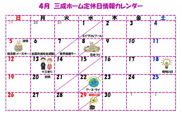 4月の定休日カレンダーが出来ました